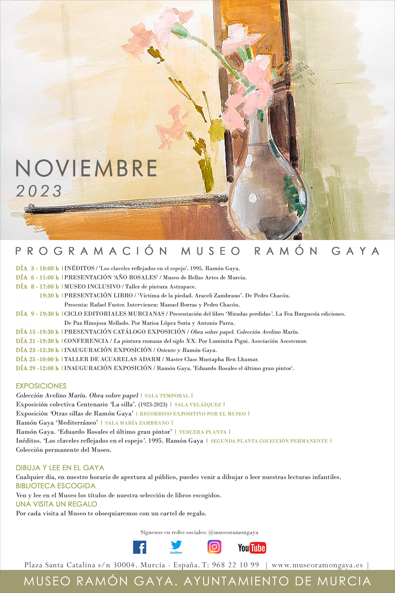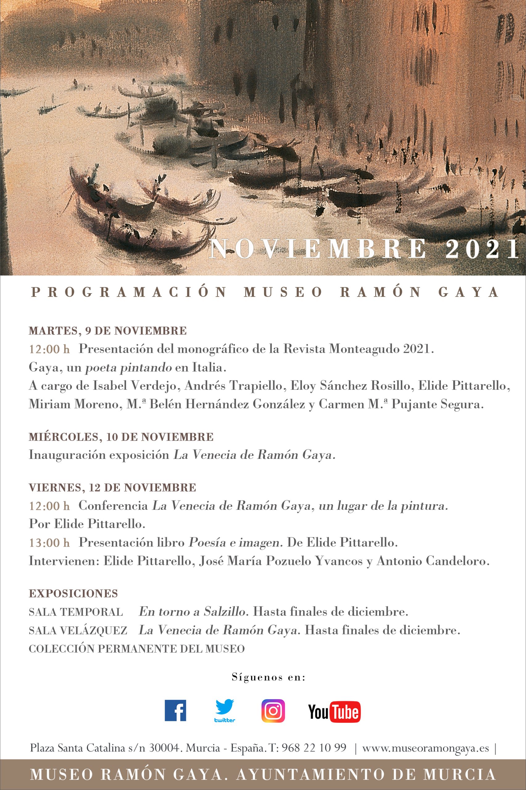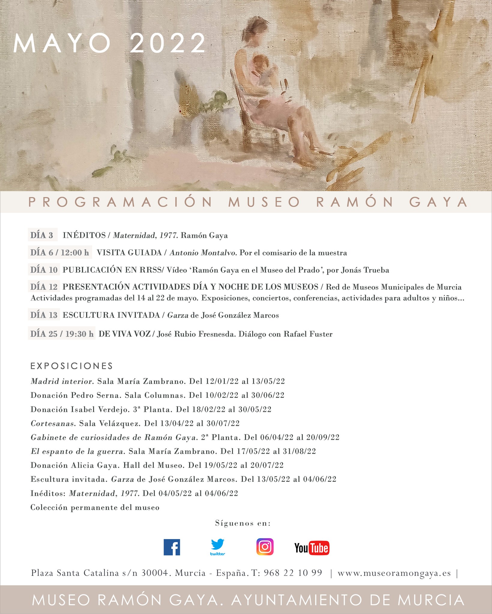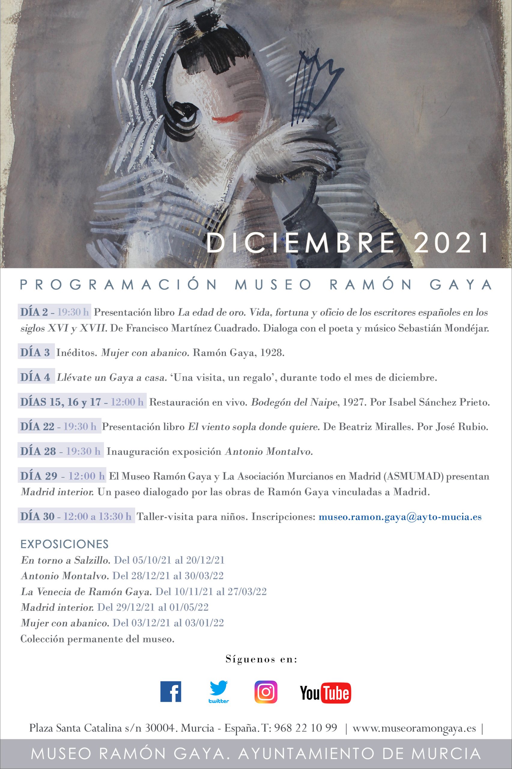 A las 19:00 h. Fuera del Museo Ramón Gaya, tendrá lugar en el madrileño Ateneo el Homenaje a Ramón Gaya a cargo de María Teresa Pedraza y Antonio Charraza Montiel, presentado por María Carmen Martínez Coello. Homenaje en el Ateneo de Madrid.