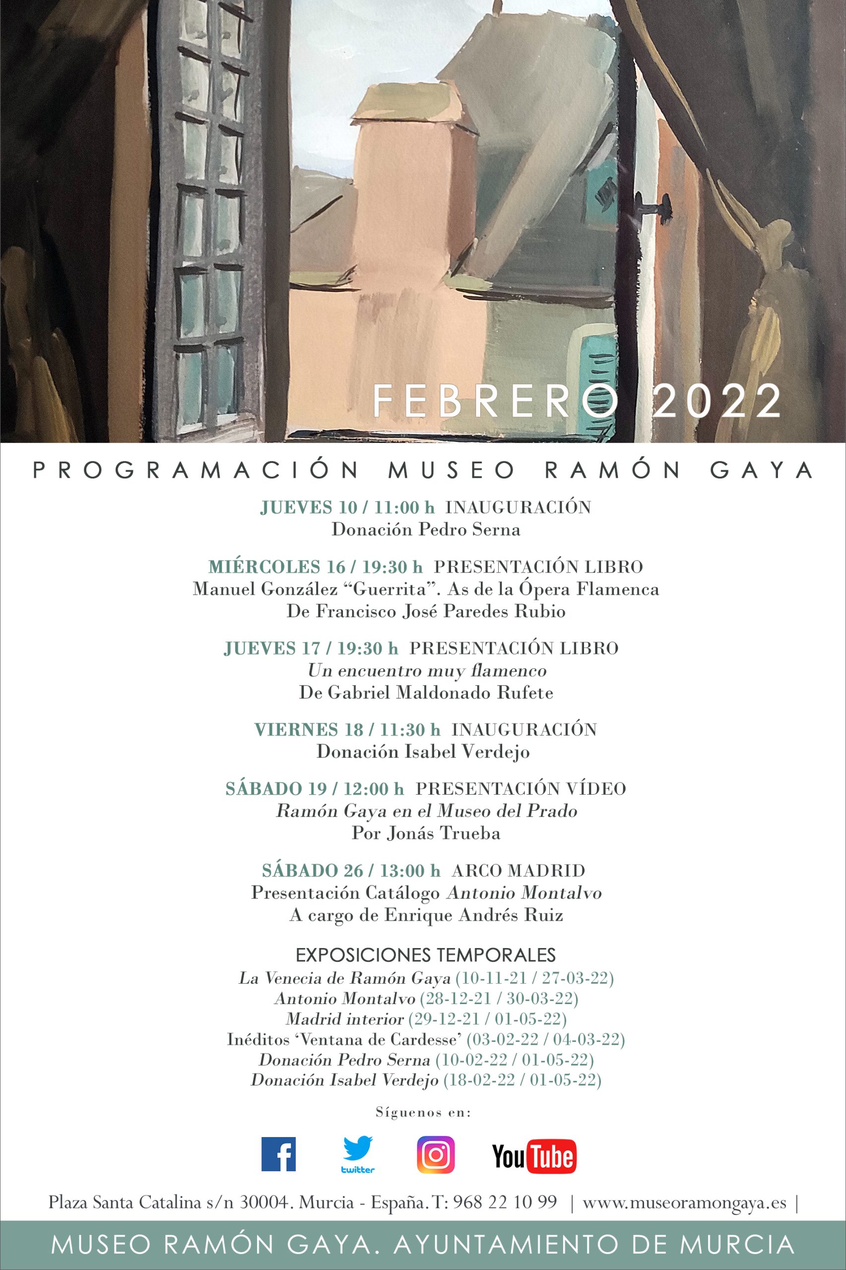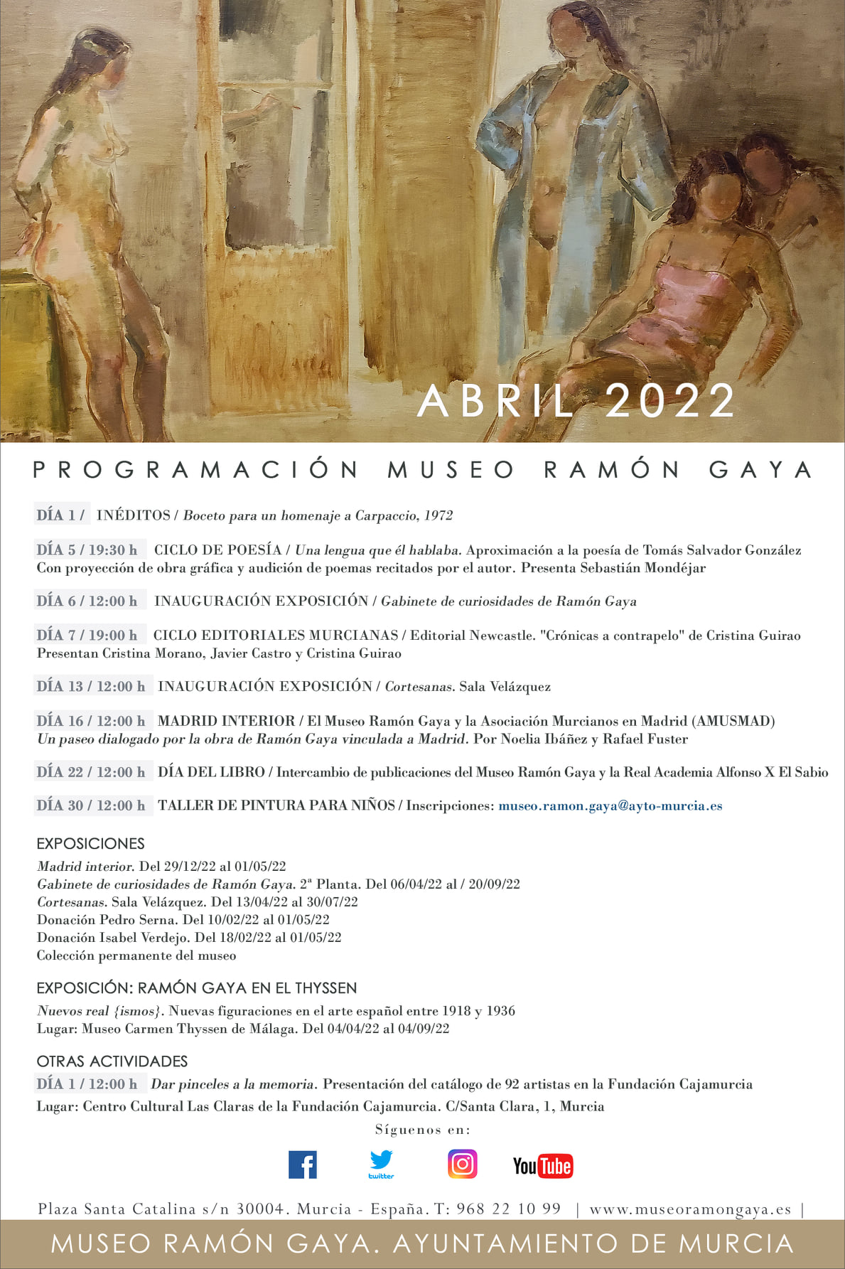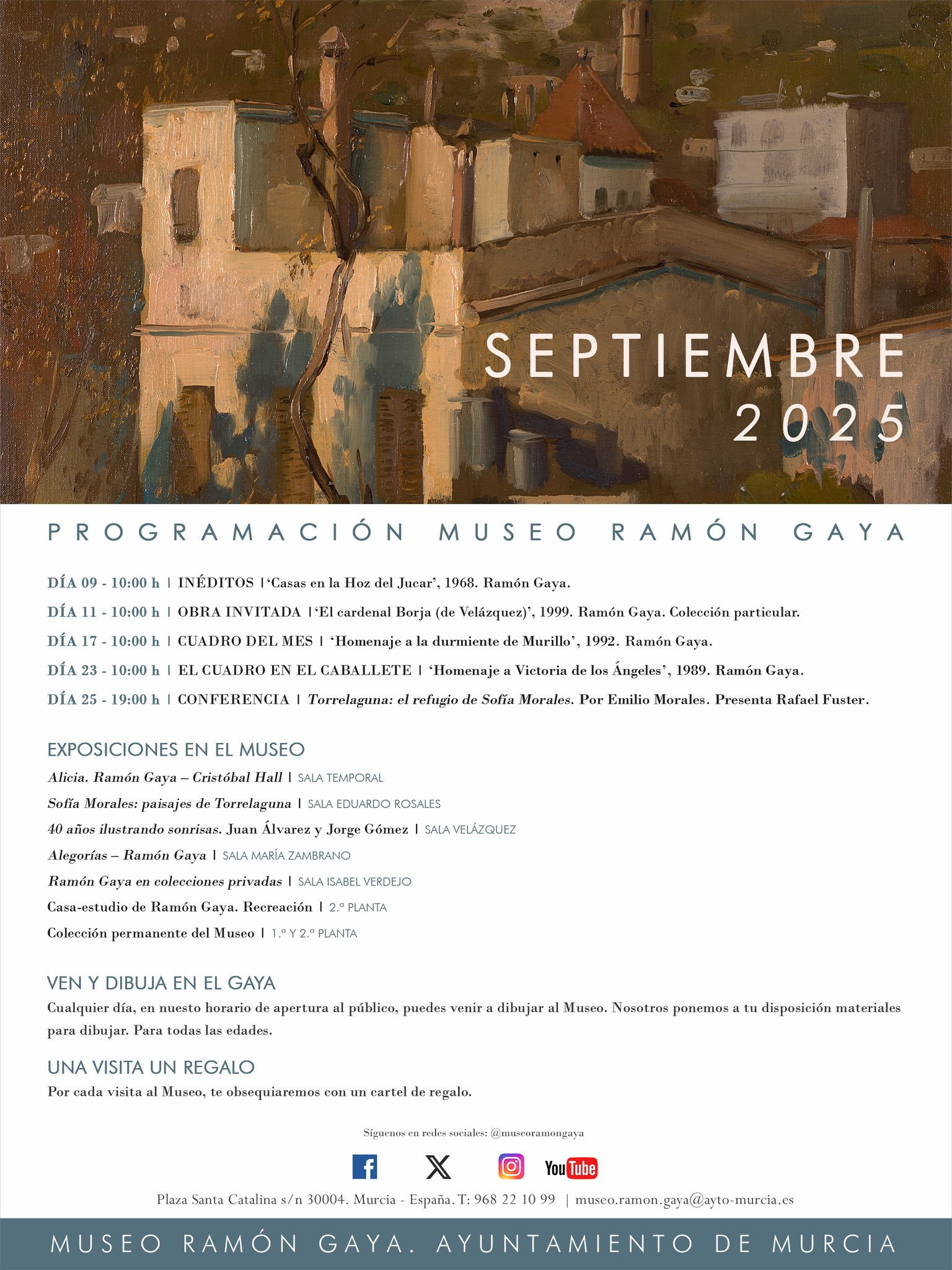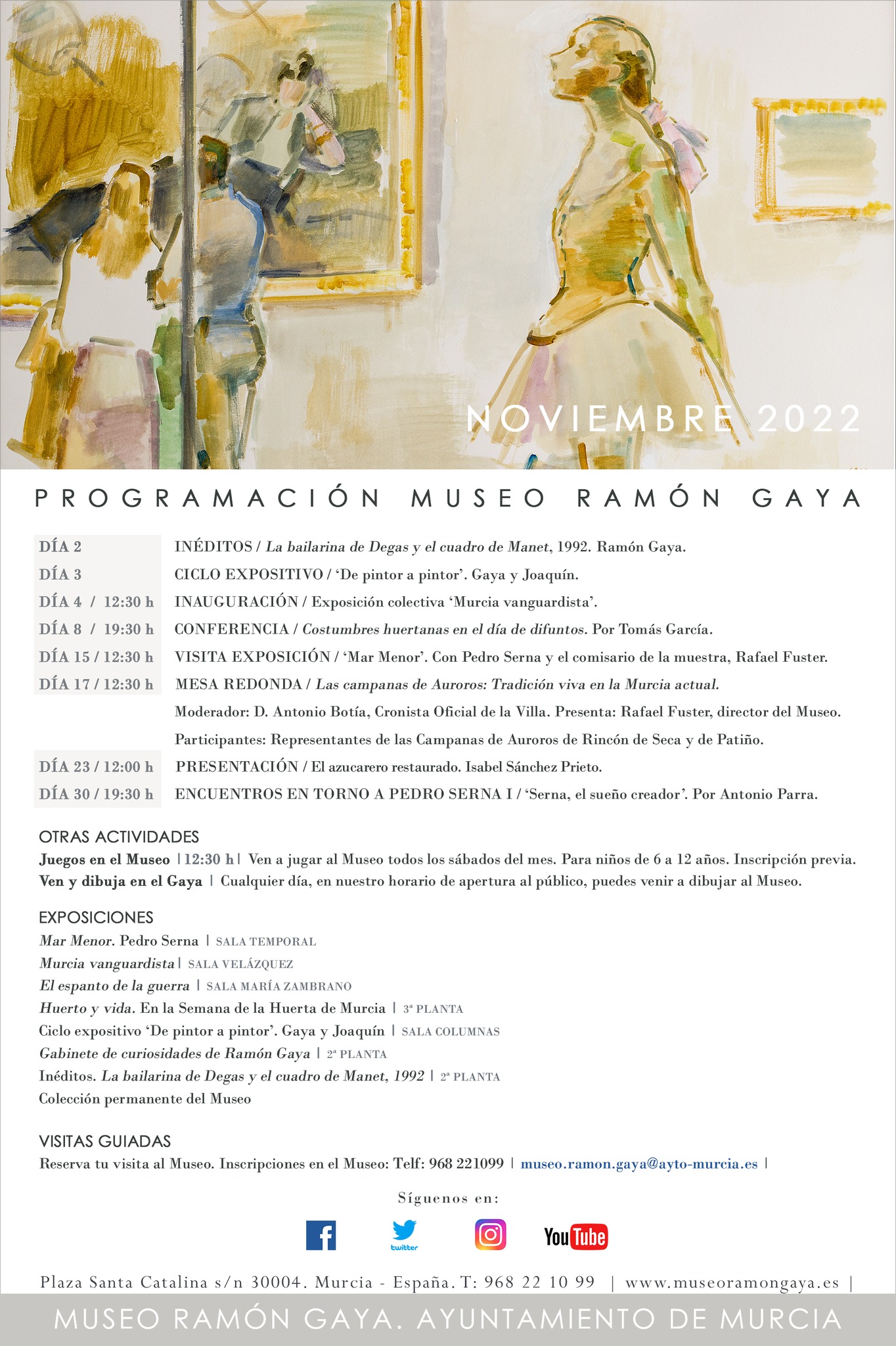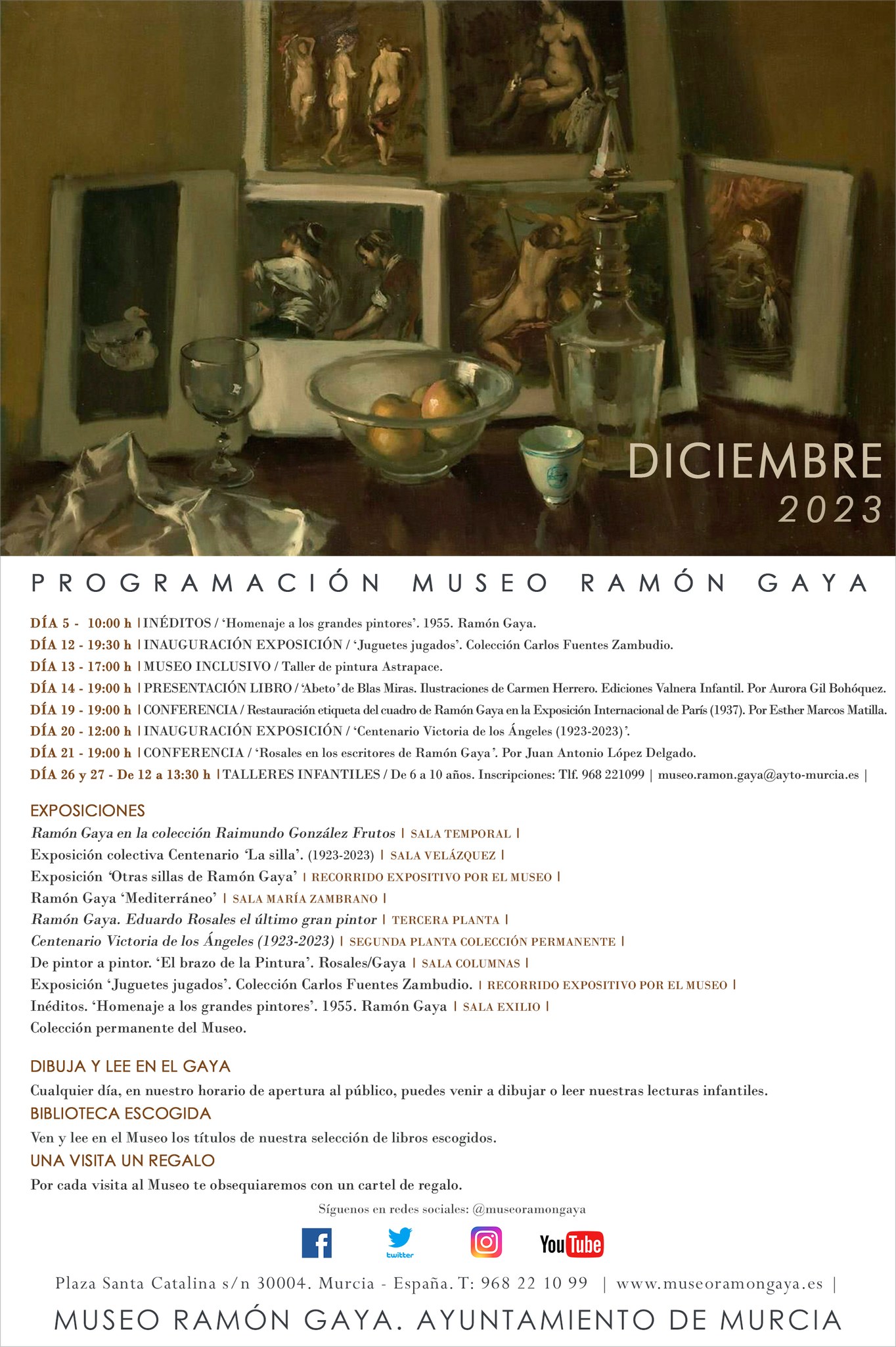 A las 19:00 h. Fuera del Museo Ramón Gaya, tendrá lugar en el madrileño Ateneo el Homenaje a Ramón Gaya a cargo de María Teresa Pedraza y Antonio Charraza Montiel, presentado por María Carmen Martínez Coello. Homenaje en el Ateneo de Madrid.