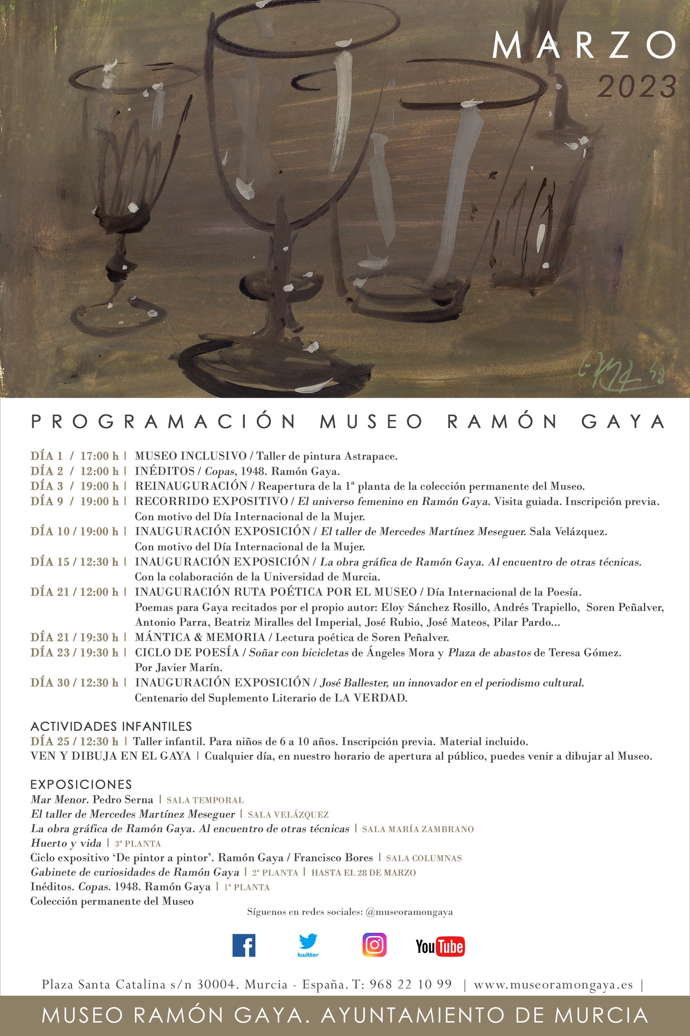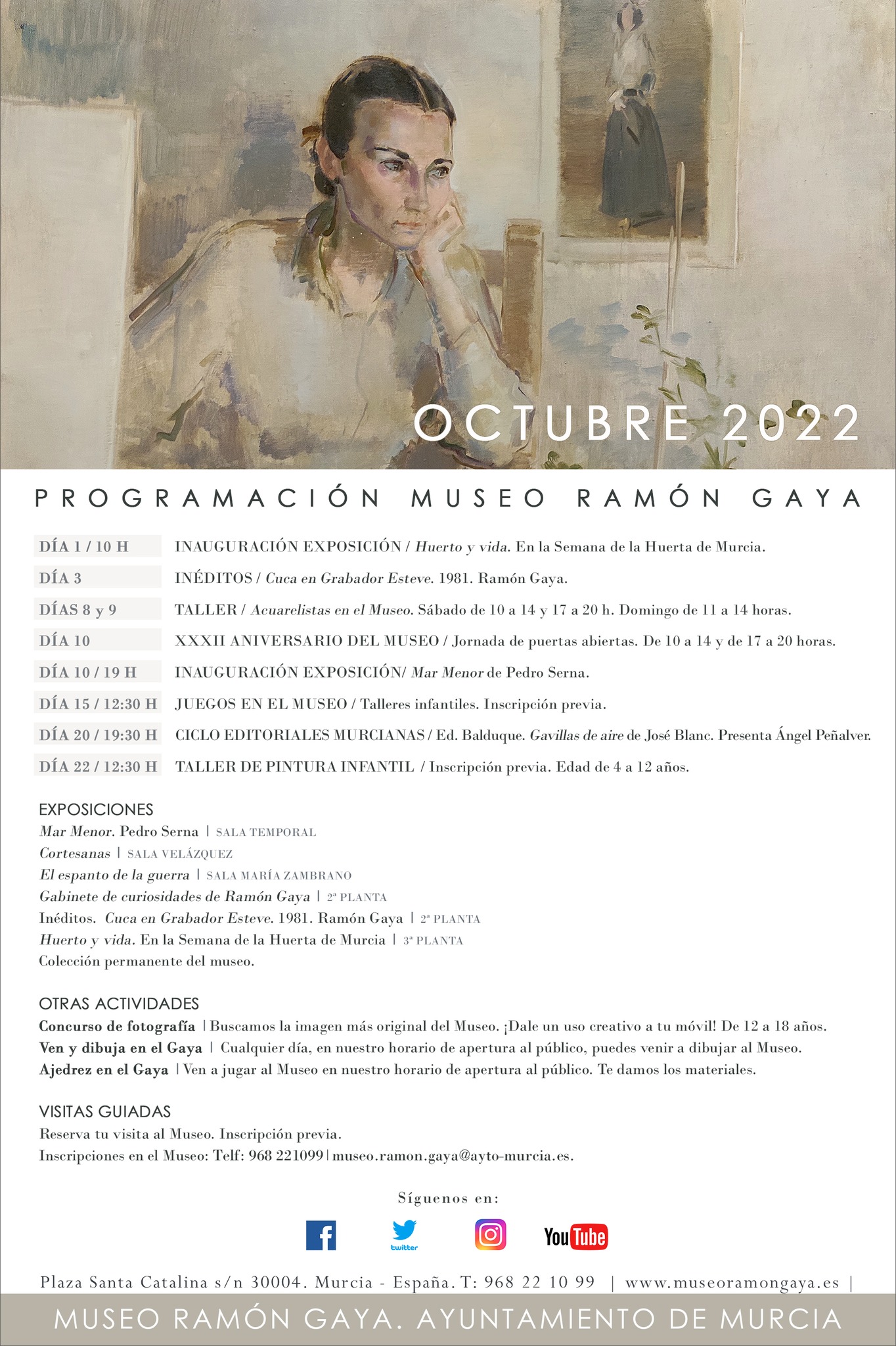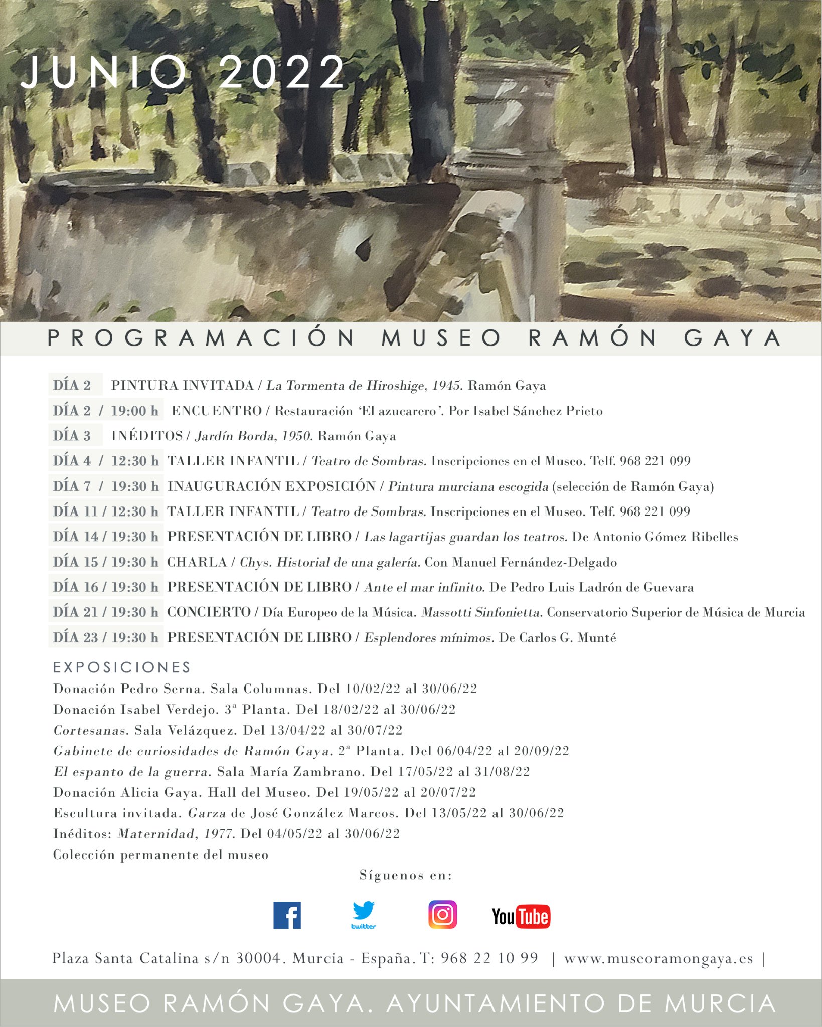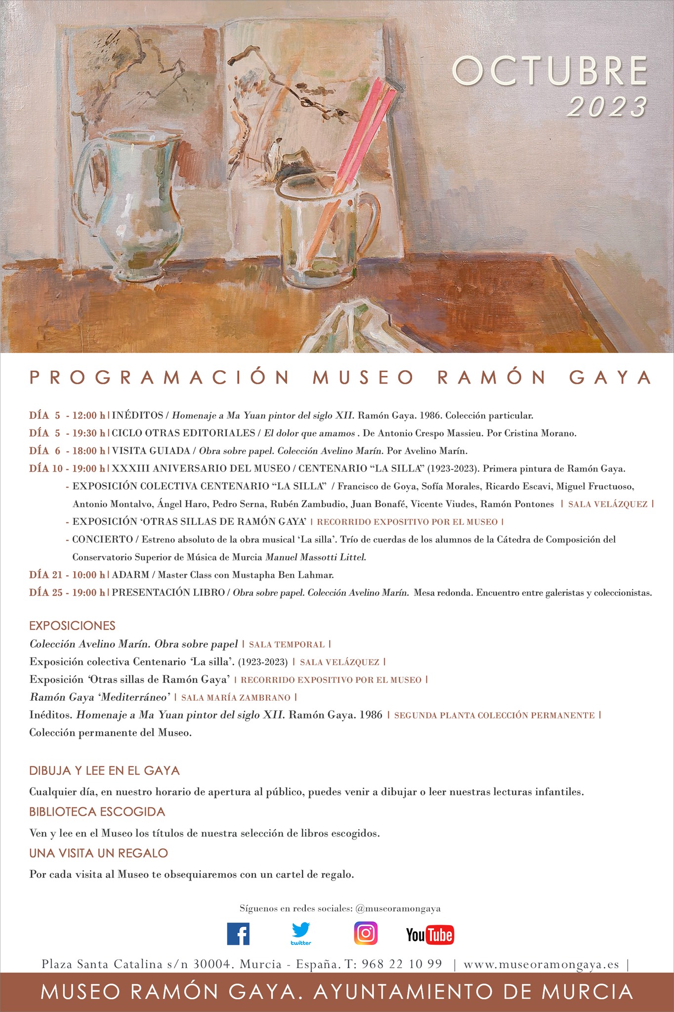 A las 19:00 h. Fuera del Museo Ramón Gaya, tendrá lugar en el madrileño Ateneo el Homenaje a Ramón Gaya a cargo de María Teresa Pedraza y Antonio Charraza Montiel, presentado por María Carmen Martínez Coello. Homenaje en el Ateneo de Madrid.