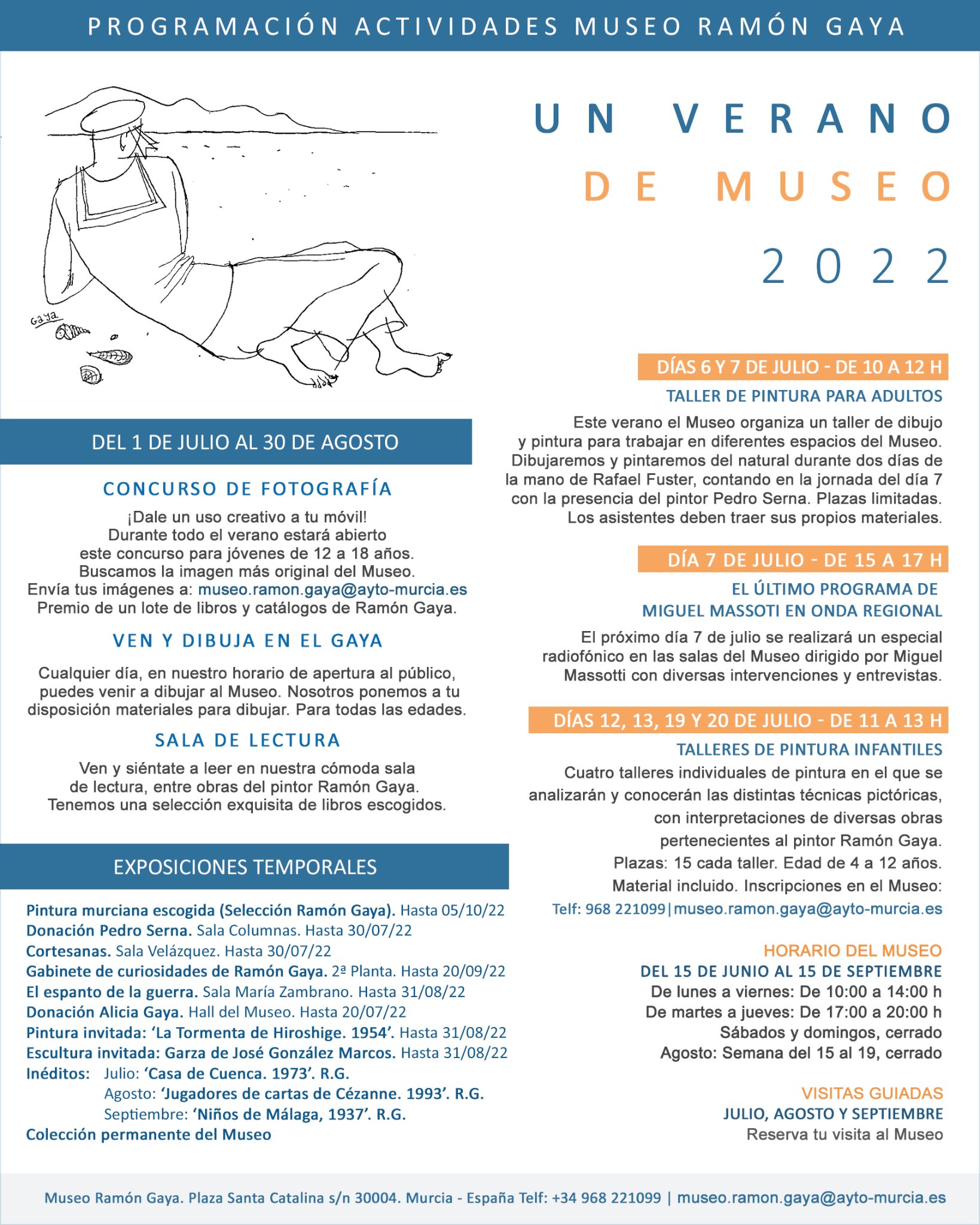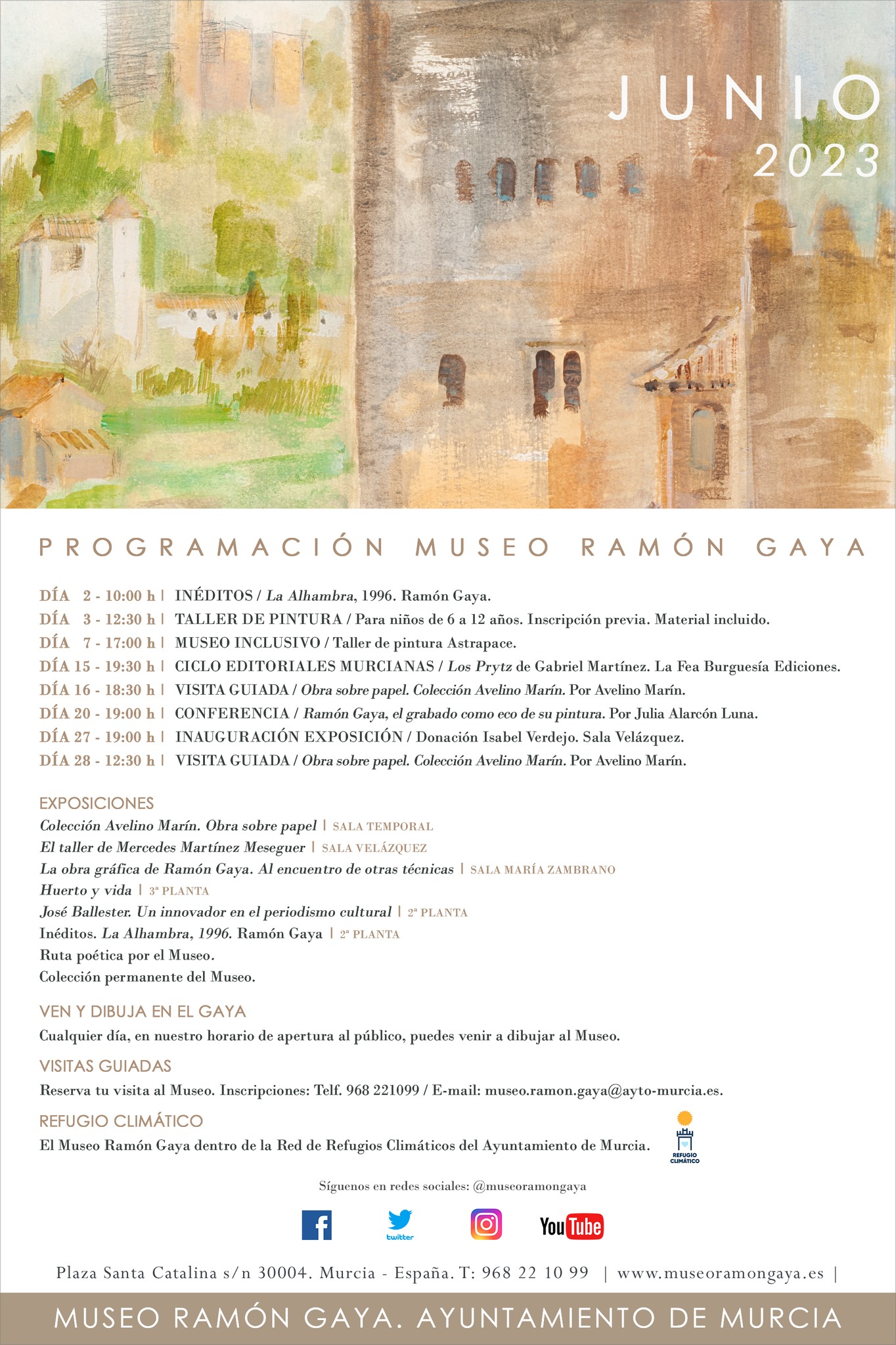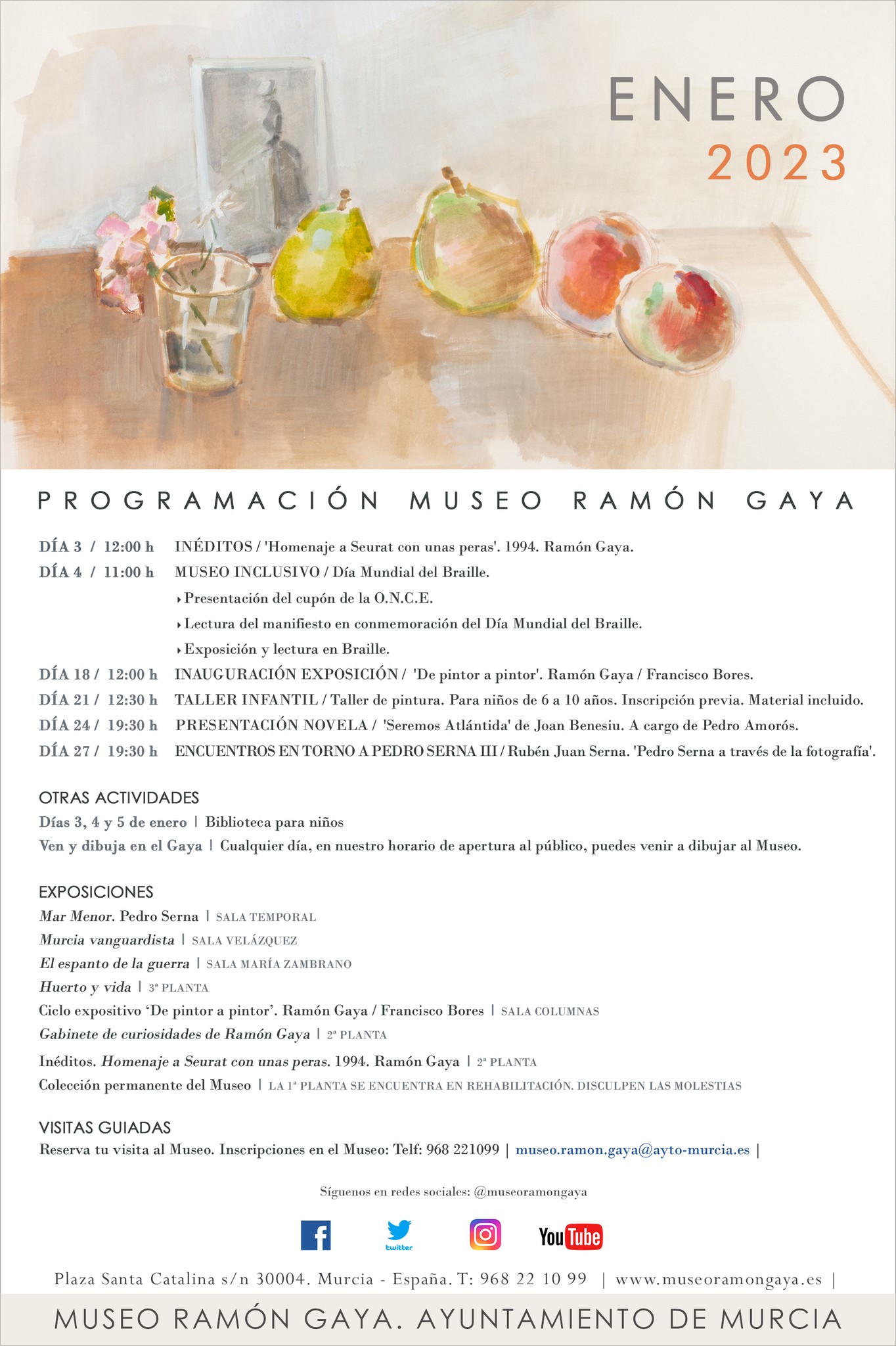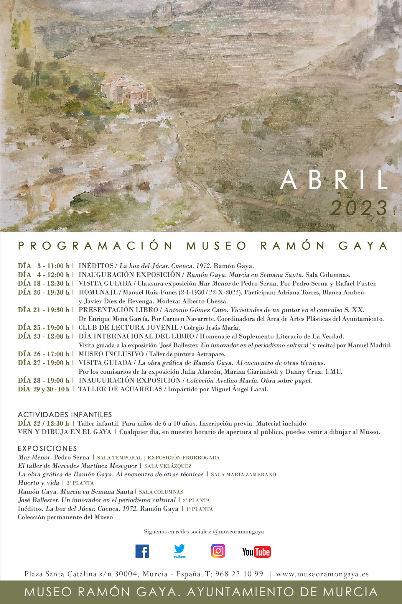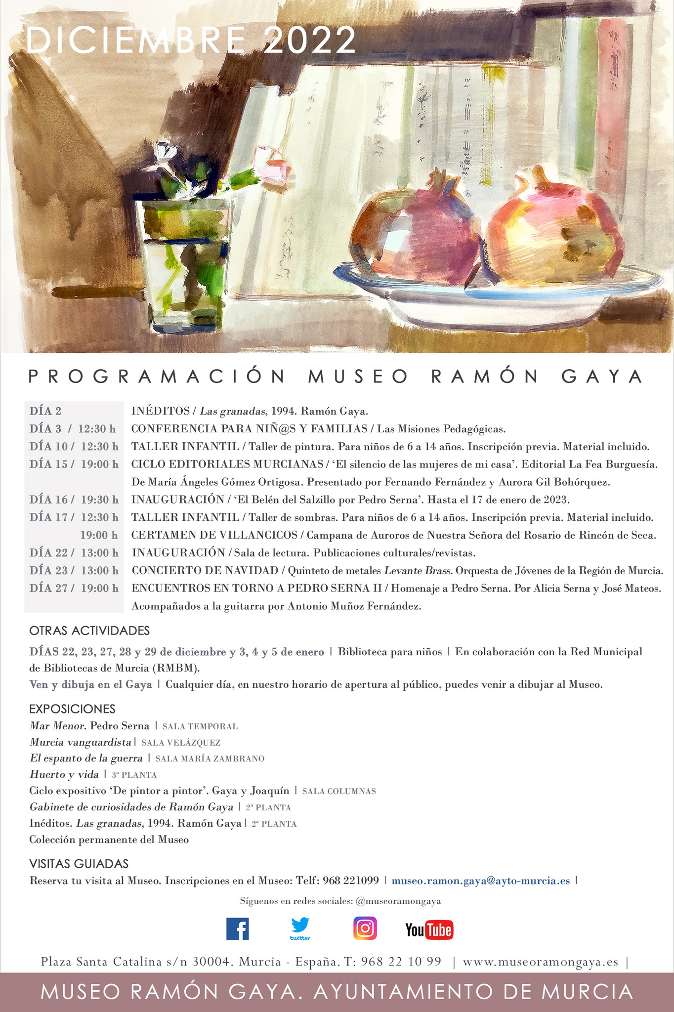 A las 19:00 h. Fuera del Museo Ramón Gaya, tendrá lugar en el madrileño Ateneo el Homenaje a Ramón Gaya a cargo de María Teresa Pedraza y Antonio Charraza Montiel, presentado por María Carmen Martínez Coello. Homenaje en el Ateneo de Madrid.