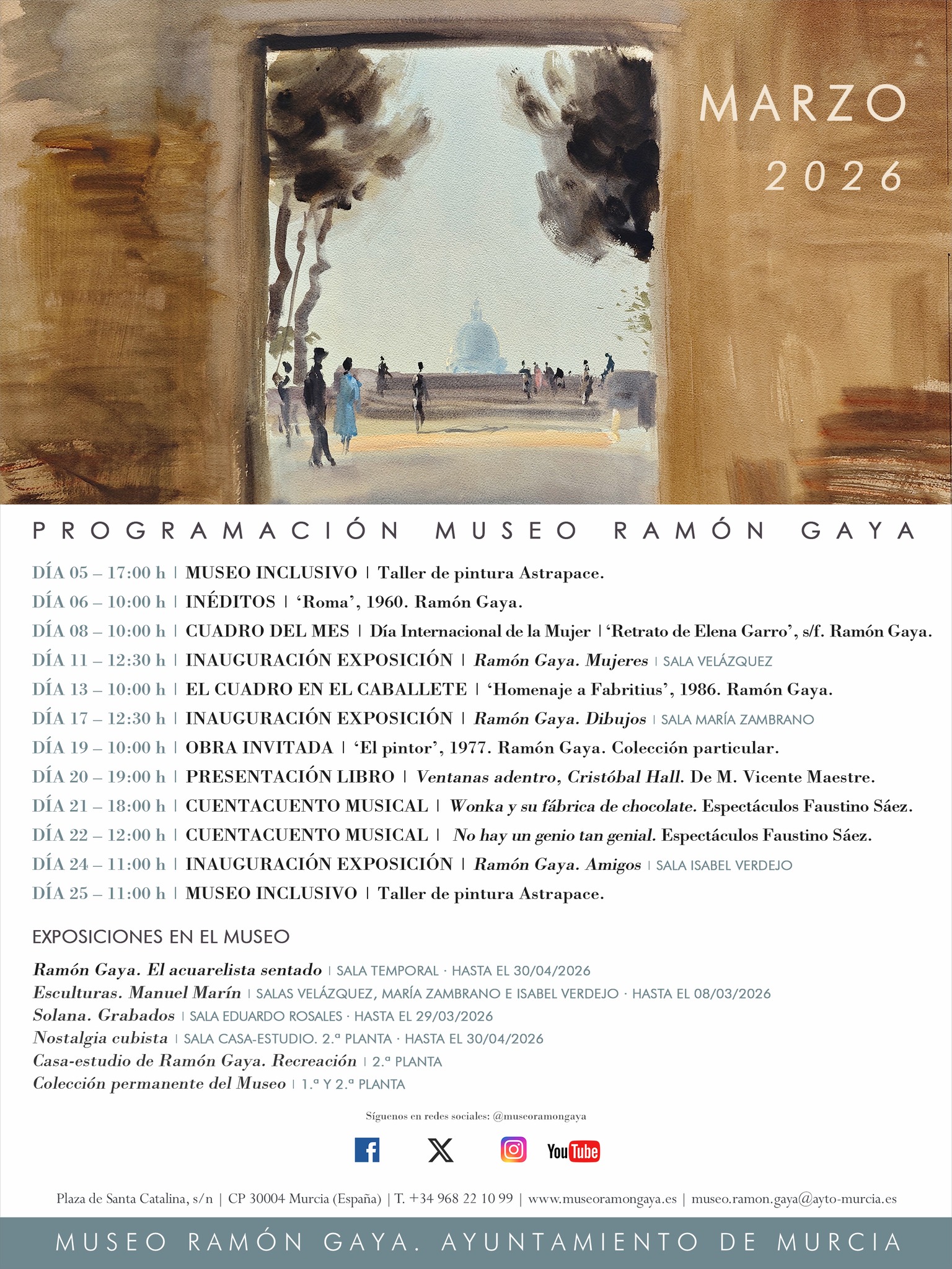 Ramón Gaya. El acuarelista sentado (Serna visto por Gaya) reúne obras que reflejan la relación artística y personal entre Ramón Gaya y Pedro Serna. A través de homenajes, retratos y paisajes, la exposición muestra cómo la amistad entre ambos se convierte en materia pictórica.