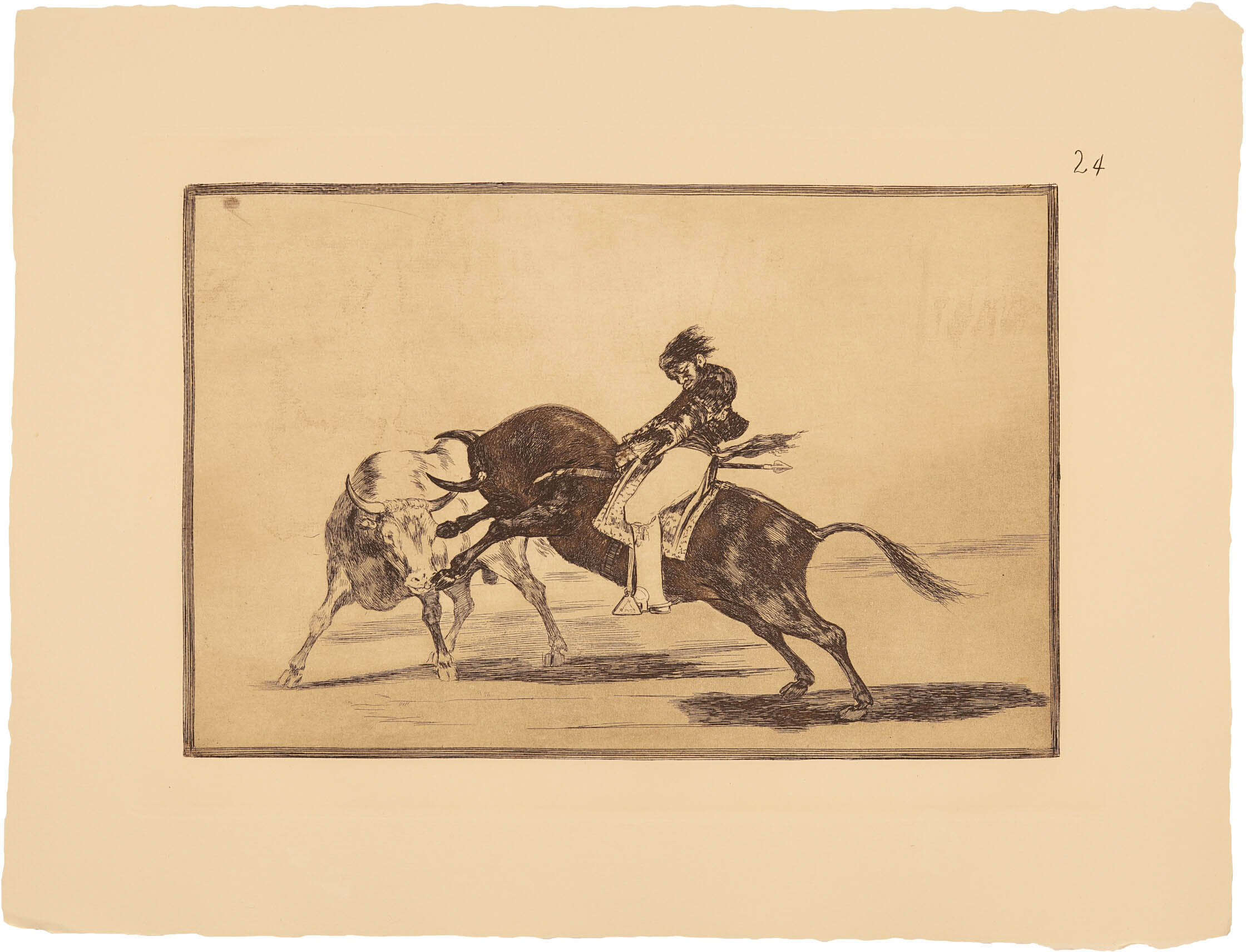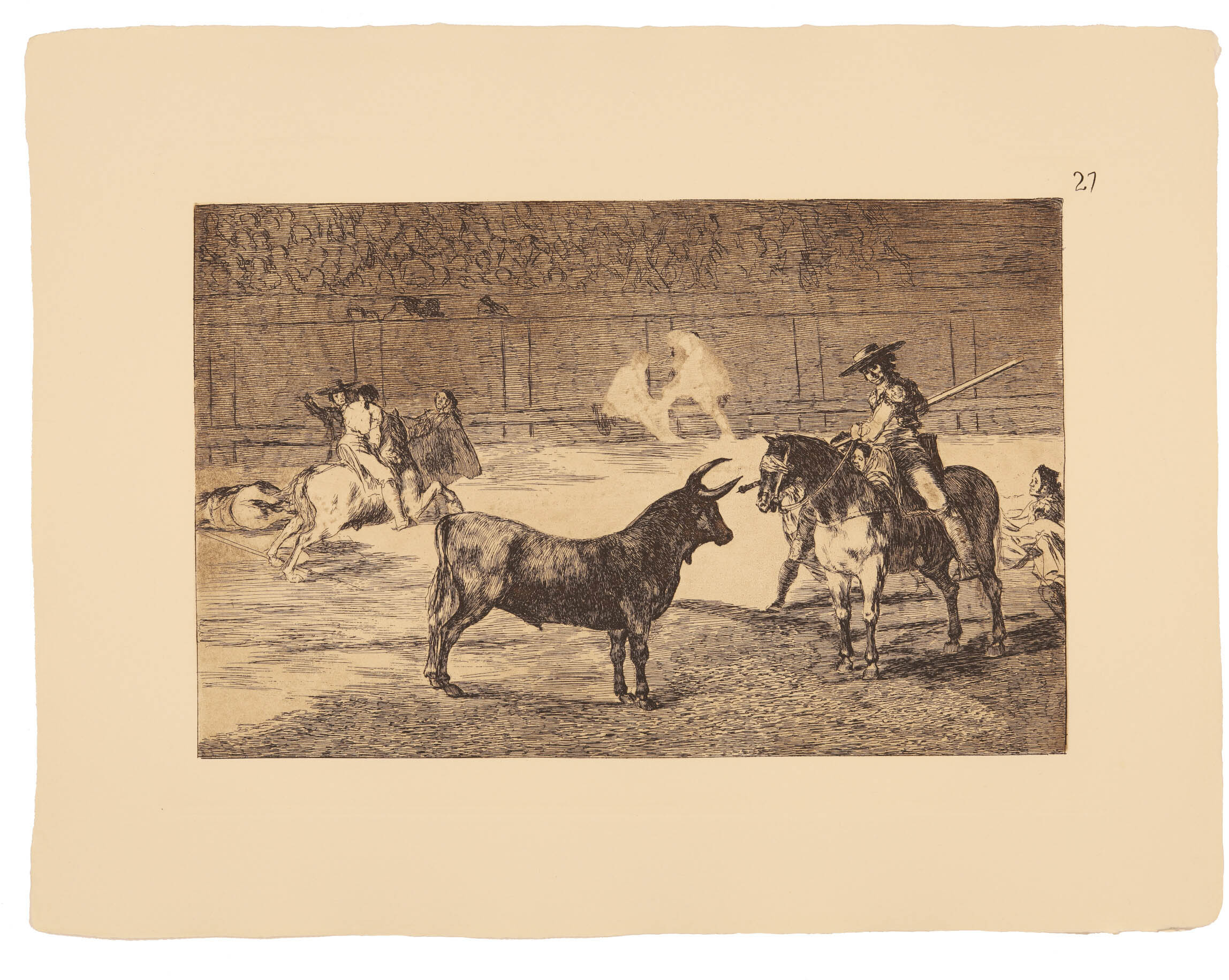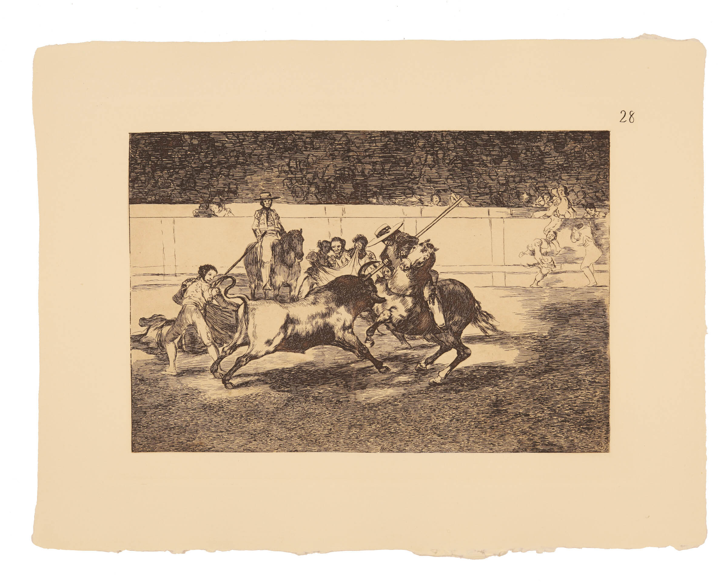 La primera serie de La Tauromaquia fue grabada entre la primavera de 1814 y el otoño de 1816. “Colección de estampas realizadas por “Francisco Goya, pintor de cámara de S.M.”, representando diversas suertes de toros. Véndese en el almacén de estampas, calle Mayor, frente a la casa del Excmo. Sr. conde de Oñate, á 10 Reales, cada una suelta, y a 300 Reales, cada juego completo, que se compone de 33”. (Fuente: Diario de Madrid, 28-10-1816)