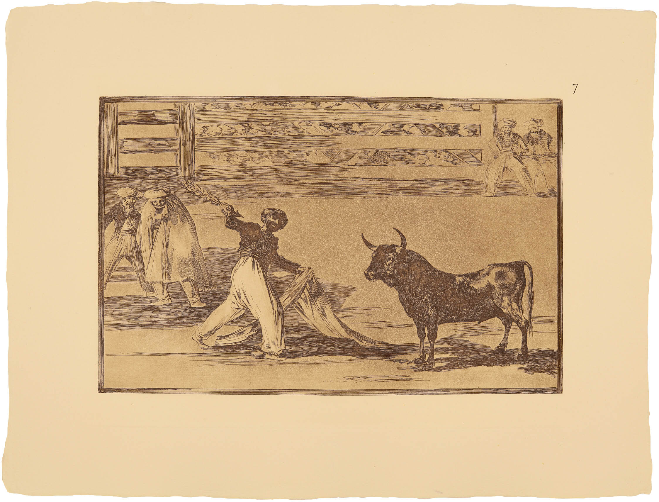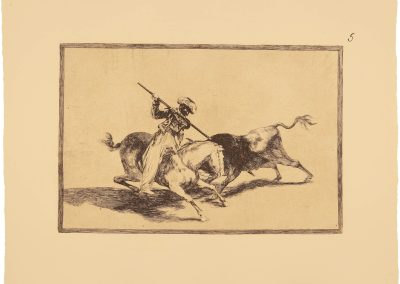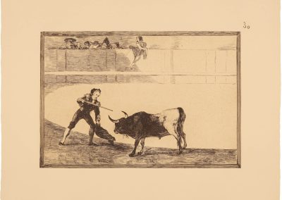 “El entusiasmo de Goya por este espectáculo netamente español lo prueba la serie de obras pictóricas que dedicó a reproducir escenas taurinas de todo género. Ese entusiasmo perduró en el artista hasta su última época, como demuestra una carta de Moratín, fechada en Burdeos en 1825, cuando el pintor y el poeta se encontraban expatriados, en la que se lee: ‘Goya dice que él ha toreado en su tiempo y que con la espada en la mano a nadie teme. Dentro de dos meses va a cumplir 80 años.’ En su faceta de grabador, dedicó al espectáculo de los toros esta importante serie de aguafuertes que nos ocupa, una de las más famosas y artísticas que se hayan realizado. Muestra en ella un deseo de manifestar erudición, no contentándose con reproducir suertes y actitudes de la lidia —es decir, el toreo como espectáculo—. Aun cuando la serie se titula Tauromaquia, vocablo que solo expresa el arte de lidiar toros, su contenido demuestra que el artista quiso ir más allá: representar la lucha del hombre con el toro en toda su dimensión. Algunas de sus láminas —las primeras de la serie— adquieren incluso un carácter legendario e histórico, haciendo aparecer árabes, moros y personajes como el moro Gazul, el Cid Campeador o Carlos V.”